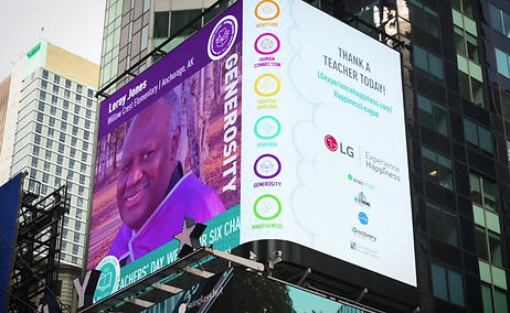 As a motion graphics specialist, I was contracted to create two animated ads for LG's Happiness Hero campaign. The ads were designed to be displayed on billboards located in Times Square, NYC, with a primary focus on expressing gratitude towards teachers for their hard work and resilience during the pandemic. As part of the campaign, LG donated computers and TVs to schools.